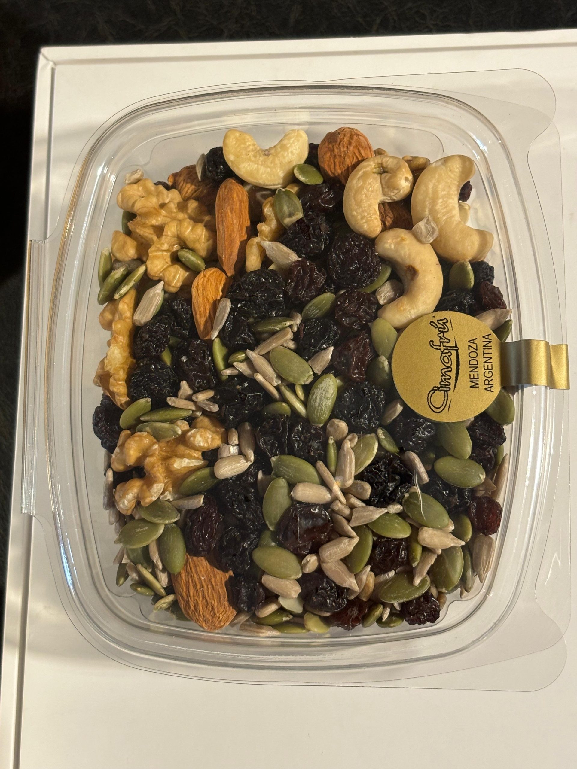 Semillas de zapallo, pasas de uva, nueces, castaña de cajú, almendras y semillas de girasol. Peso neto: 150 gramos.